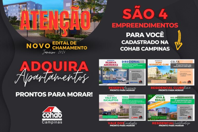 Unidades próprias da Companhia estão distribuídas em quatro empreendimentos e podem ser financiadas pelo programa Minha Casa Minha Vida. A Companhia de Habitação Popular de Campinas (Cohab) lançou oficialmente o Edital de Chamamento N° 01/2026,