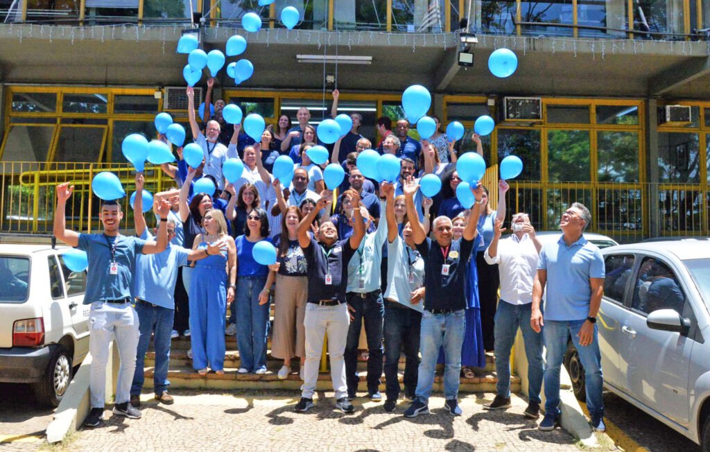 Hoje a escadaria do nosso estacionamento ficou pequena para tanta energia boa! Nossos colaboradores – homens e mulheres – vestiram a camisa (literalmente!) e coloriram o dia de azul.